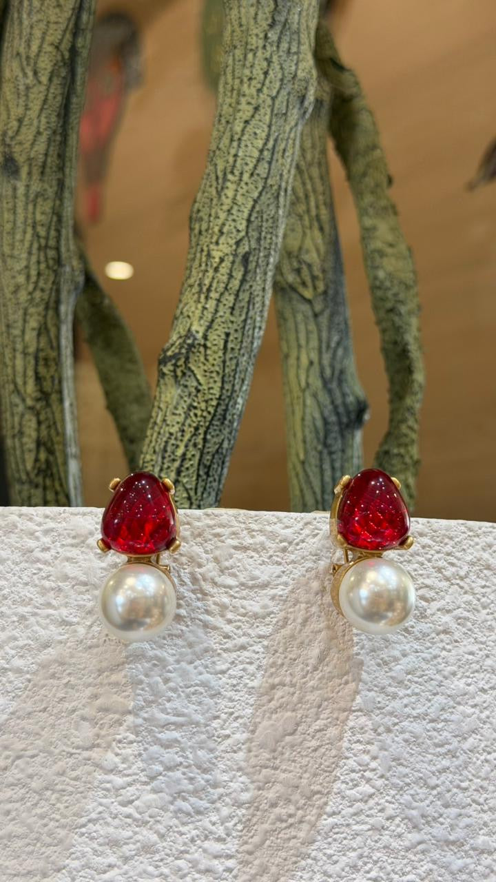 Elegant gold-tone studs featuring a deep ruby-red stone paired with a classic pearl drop—perfect for festive and formal wear.