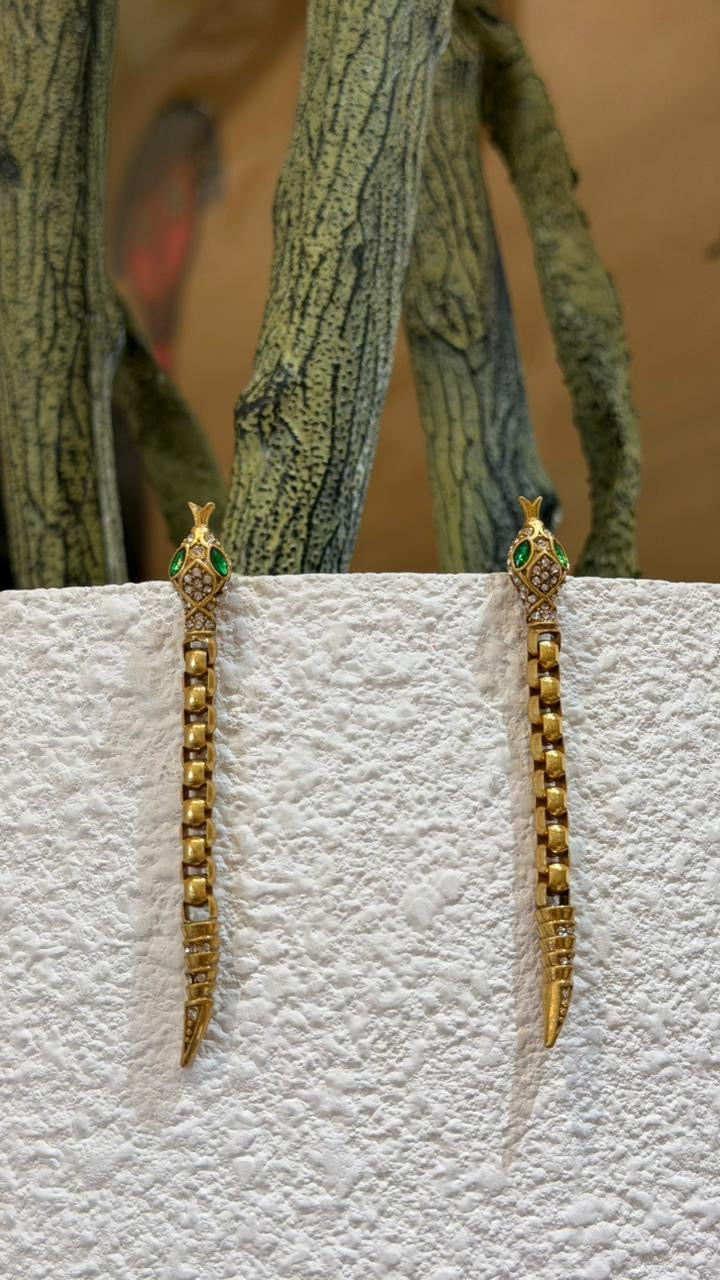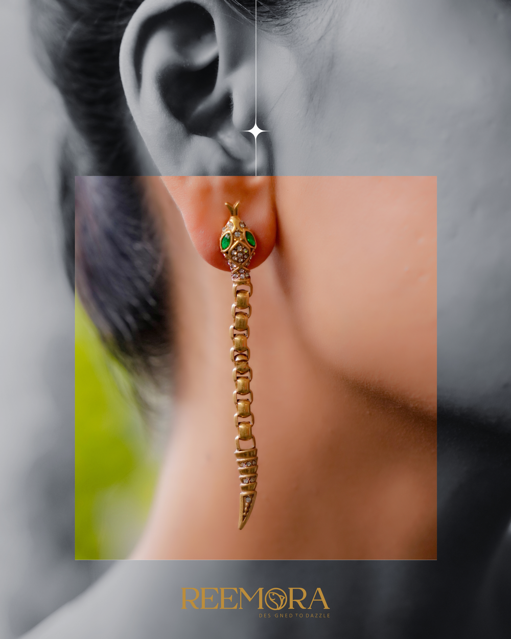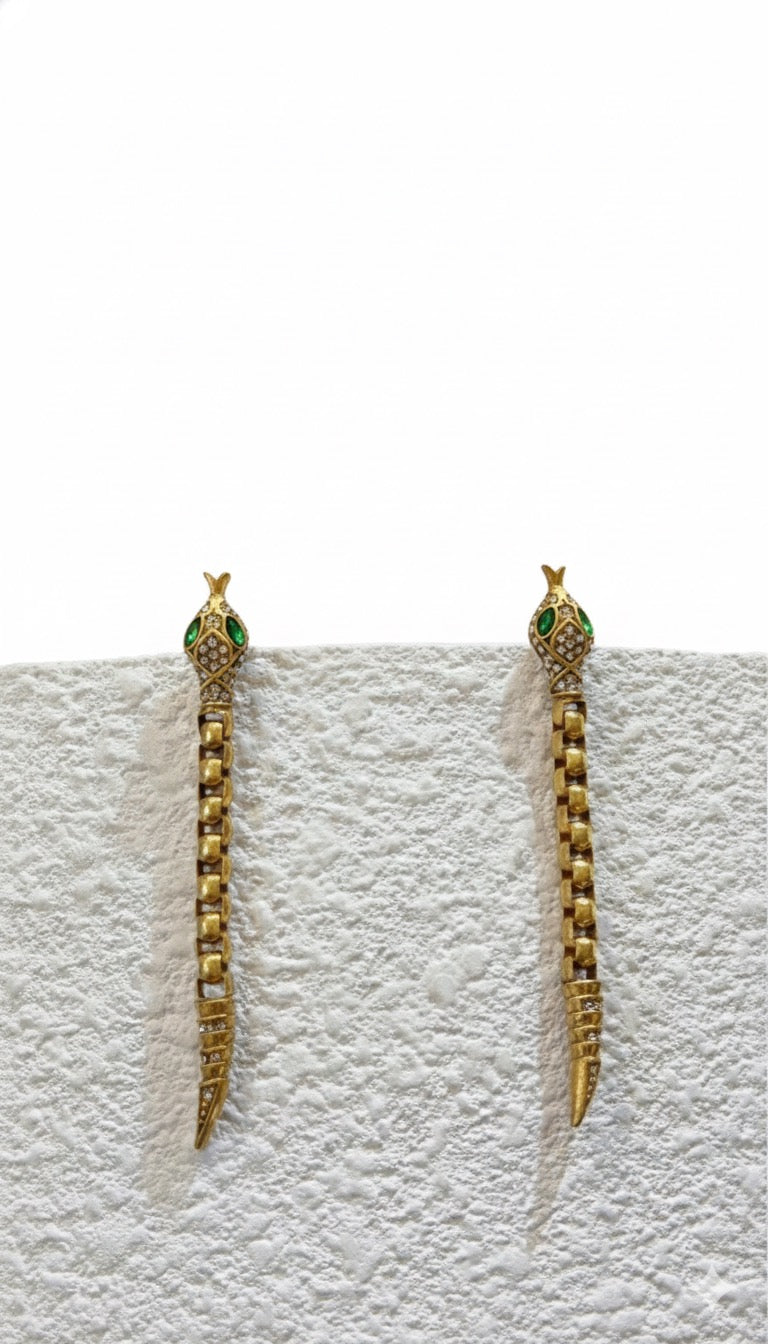 Bold gold-tone earrings with a snake-inspired design featuring green stone accents and a long chain drop—perfect for edgy and statement styling.