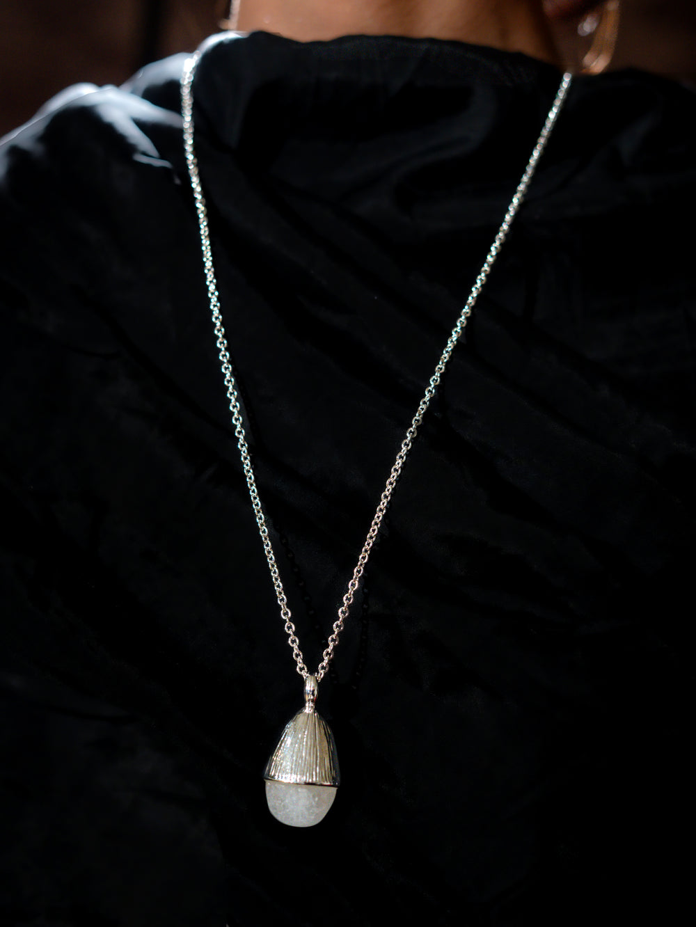 A minimalist silver-tone chain featuring an elegant acorn-inspired pendant with a soft white stone, offering understated charm and modern sophistication.