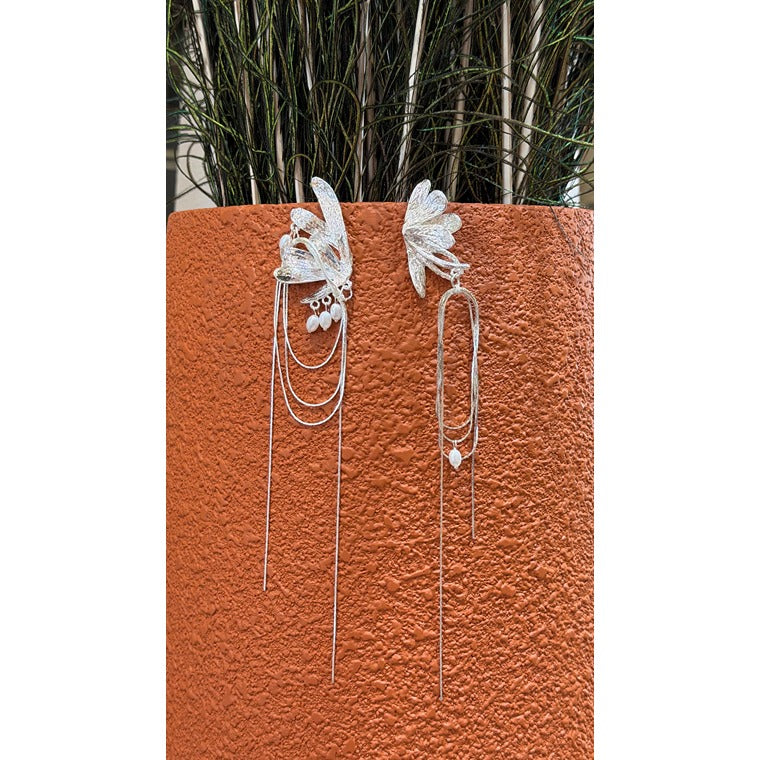 Elegant silver drop earrings featuring sculpted leaf motifs with cascading chain accents, creating a graceful, modern statement with fluid movement and refined shine.