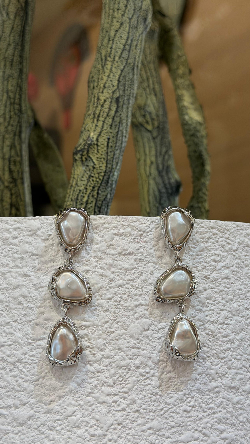 Elegant silver-tone earrings featuring cascading organic pearl shapes in a refined drop design. A timeless statement piece perfect for weddings, parties, and evening wear.