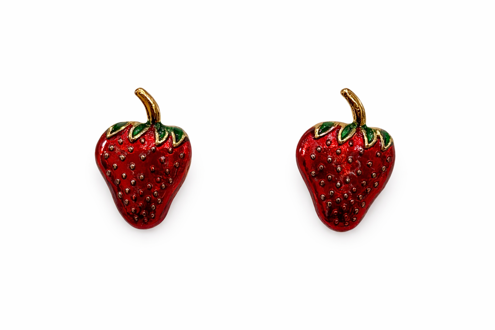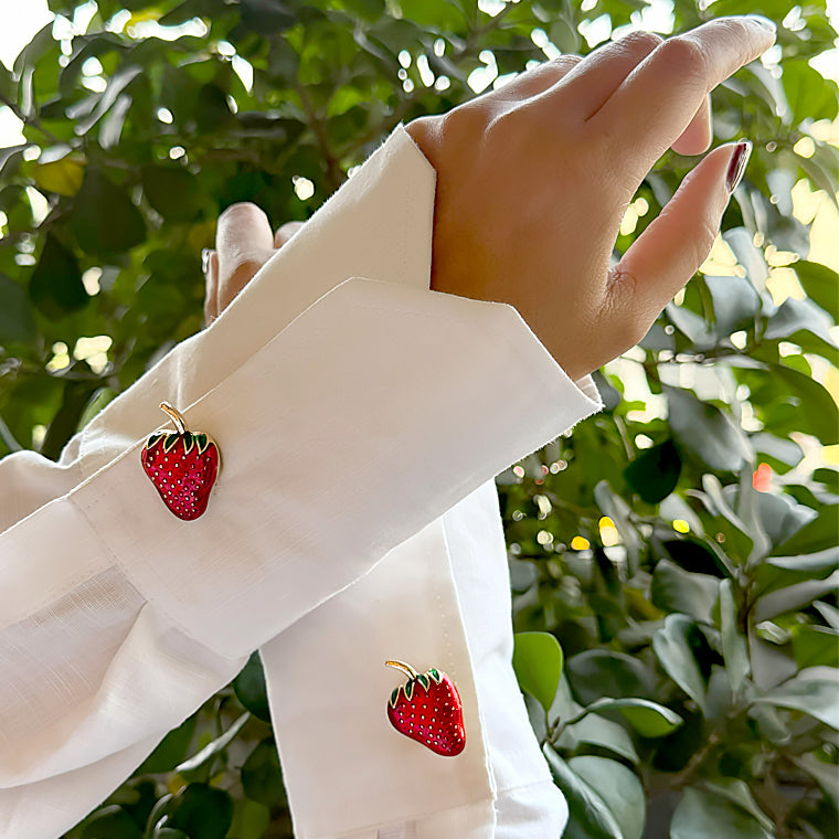 Playful yet refined, these glossy red strawberry cufflinks feature delicate seed detailing and a gold-tone stem. A fresh statement accessory that adds a touch of whimsy to crisp white shirts.