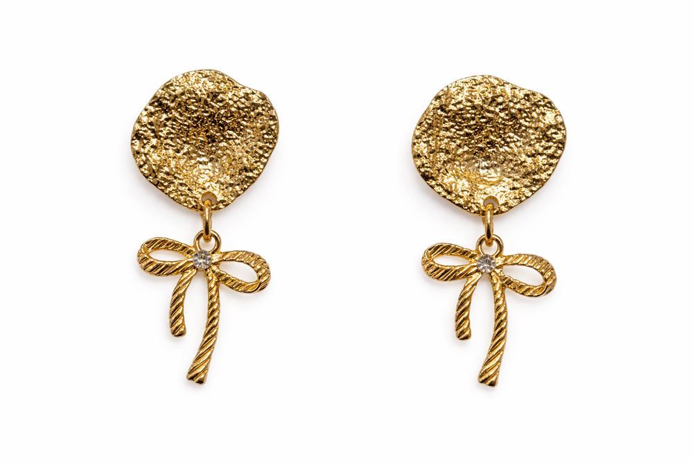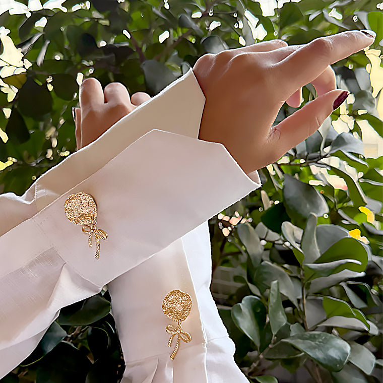 Unique and artistic, these cufflinks combine a textured gold disc with a delicate dangling bow charm. Designed to move subtly with wear, they add dimension and elegance to statement styling.