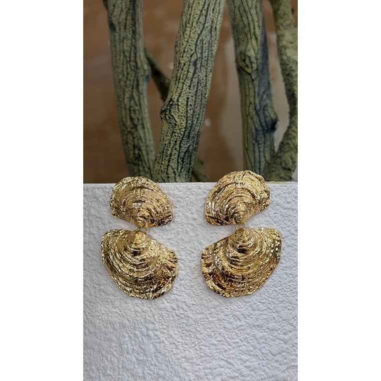 A close-up of statement gold earrings with a layered, shell-inspired texture, offering a bold yet sophisticated design that catches the light beautifully.