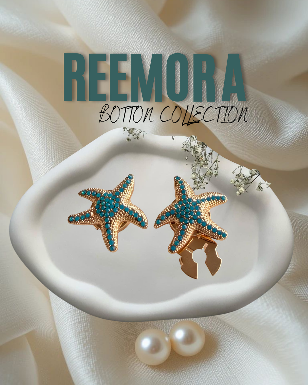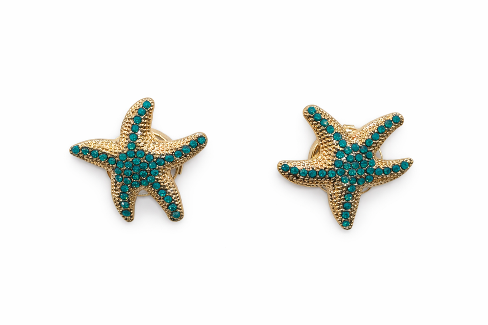 Inspired by the ocean, these gold-tone starfish cufflinks feature vibrant turquoise crystal detailing. A playful yet elegant accessory, perfect for resort wear, summer events, or statement styling.