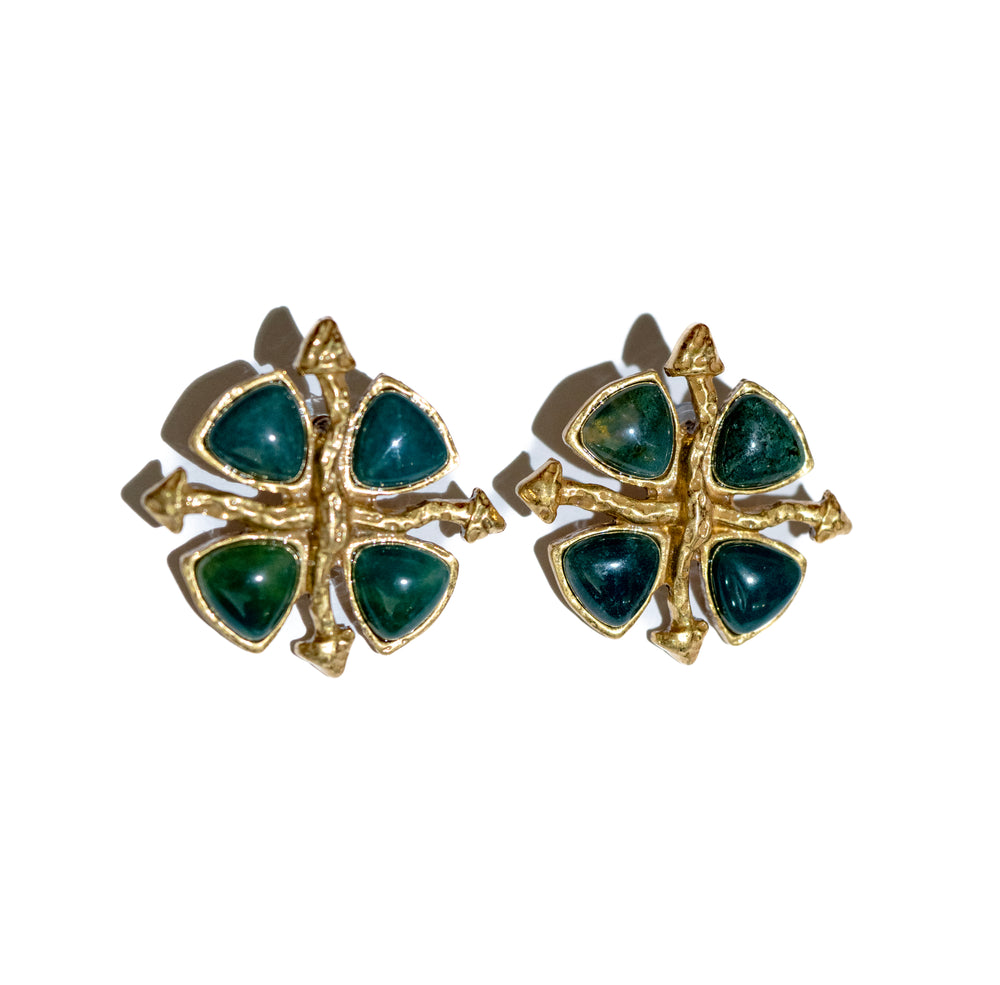 Elegant stud earrings featuring a cross-bloom design with rich green stones set in warm gold tones, symbolizing balance, nature, and timeless sophistication.