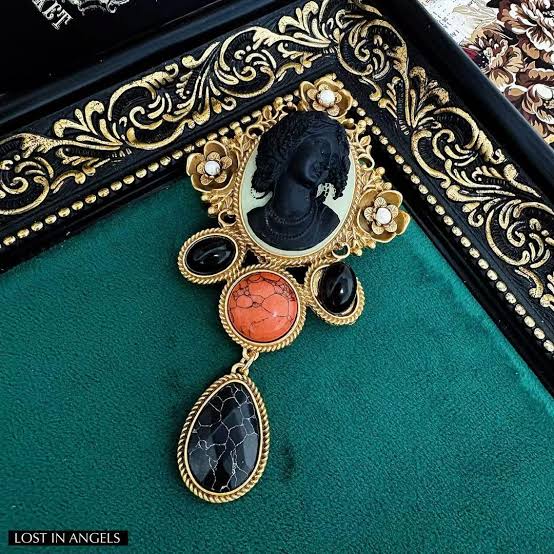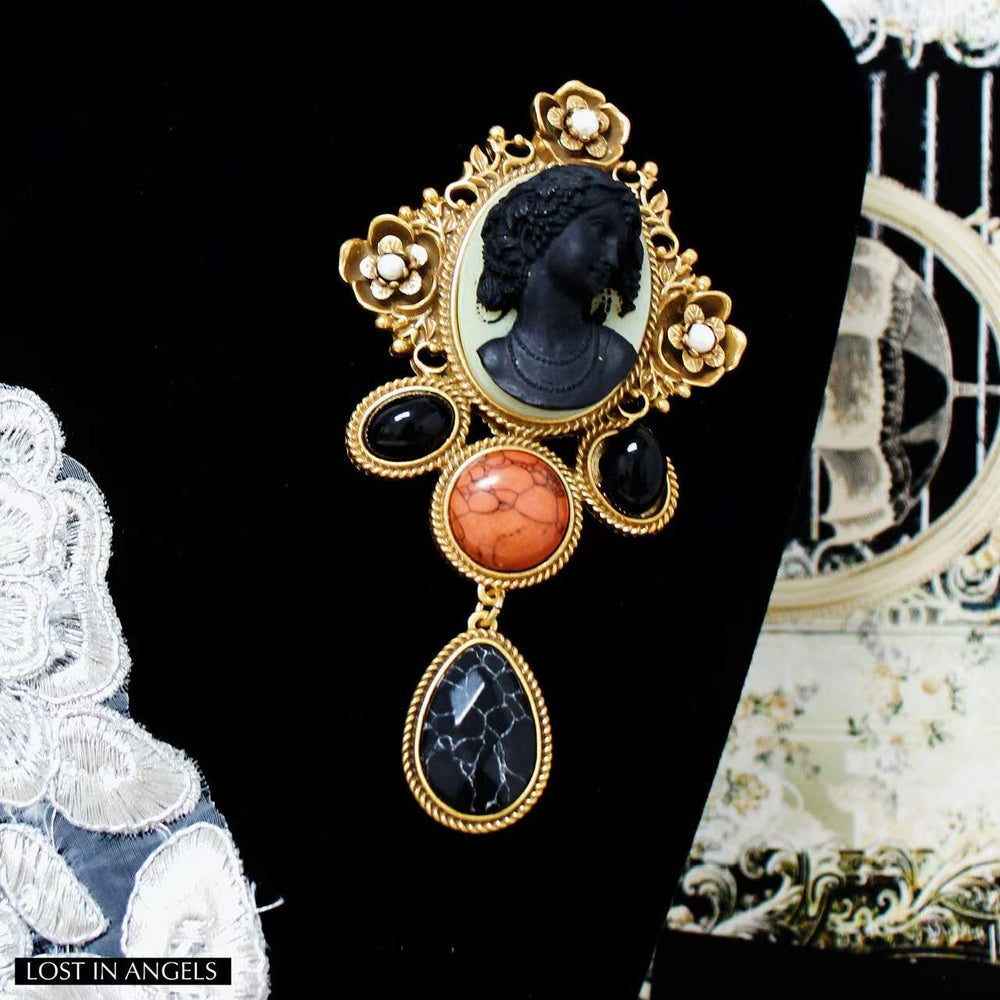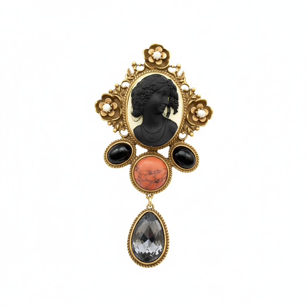 An elegant vintage-inspired brooch featuring a classic cameo portrait framed with floral gold detailing and accented by black, coral, and crystal stones. Designed as a statement blazer or saree brooch, it adds timeless heritage charm and old-world sophistication to any outfit.