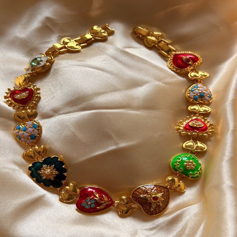 A charming gold-tone necklace featuring multicolor enamel heart and floral motifs, perfect for festive, ethnic, and fusion looks. Lightweight, elegant, and eye-catching.