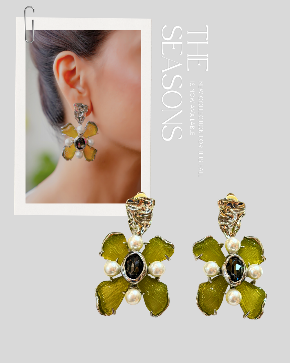 These earrings feature a floral drop design with yellow enamel petals set in a silver-tone frame. A dark central stone is accented by small white pearl details, giving the piece a balanced and elegant look. The sculpted top stud adds a modern touch, while the floral form keeps it suitable for festive and statement styling.